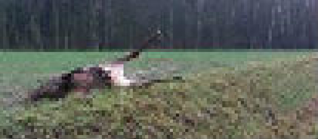 Na jezdni został potrącony przez samochód byk jelenia. - Ranne zwierzę próbowało jeszcze uciec do lasu, ale padło na polu, kilkadziesiąt metrów od drogi - mówi Grażyna Wolska, rzecznik Regionalnej Dyrekcji Lasów Państwowych.