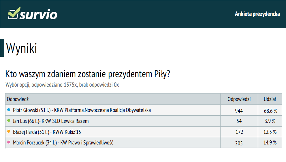 Prezentujemy wyniki naszej internetowej sondy. Przedstawiliśmy czterech kandydatów na prezydenta Piły w kolejności alfabetycznej. Od 1 do 11 października czytelnicy mogli oddać jeden głos.