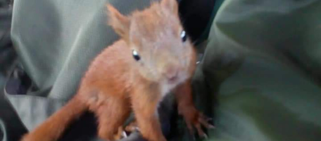 Leśnik uratował maleńką wiewiórkę. Kiedy jej matka przeskakiwała z jednego drzewa na inne, pechowo wybrała suche drzewo i zaczęła spadać.