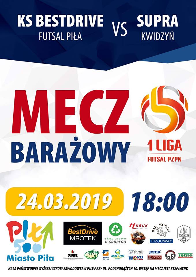 Przeciwnikiem pilan będzie drużyna SUPRA Kwidzyn, która została mistrzem pomorskiej II Ligi Futsalu. W sześciu meczach kwidzynanie zdobyli jedenaście punktów, wyprzedzając w tabeli Maj Projekt, AZS UG II Gdańsk i Beniaminka 03 Starogard Gdański. - Nie wiemy w zasadzie z kim mamy do czynienia. Zespół z Kwidzyna uważa się za amatorów z ligi trawiastej, ale swoją ligę wygrali. Zespół na pewno niezwykle groźny w ofensywie. Kilka razy zwyciężyli z przewagą dziesięciu bramek. Pomimo niewiadomej jesteśmy gotowi na każdy scenariusz tego spotkania - mówi Maciej Konert, grający trener KS BestDrive Futsal Piła.