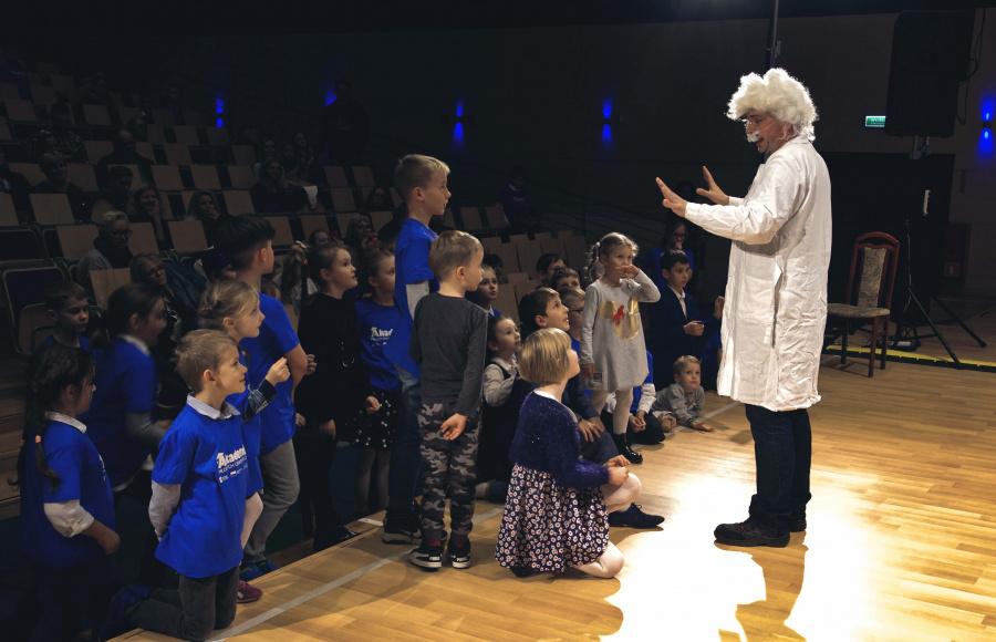 Wykład inauguracyjny poprowadził Mały Inżynier, któremu w przeprowadzaniu eksperymentów towarzyszyli najmłodsi uczestnicy projektu.
