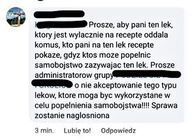 - Proszę, aby pani ten lek, który jest wyłącznie na receptę oddała komuś, kto pani na ten lek receptę pokaże, gdyż ktoś może popełnić samobójstwo zażywając ten lek. Proszę administratorów grupy o nieakceptowanie tego typu ogłoszeń - napisał pilanin na tej grupie.