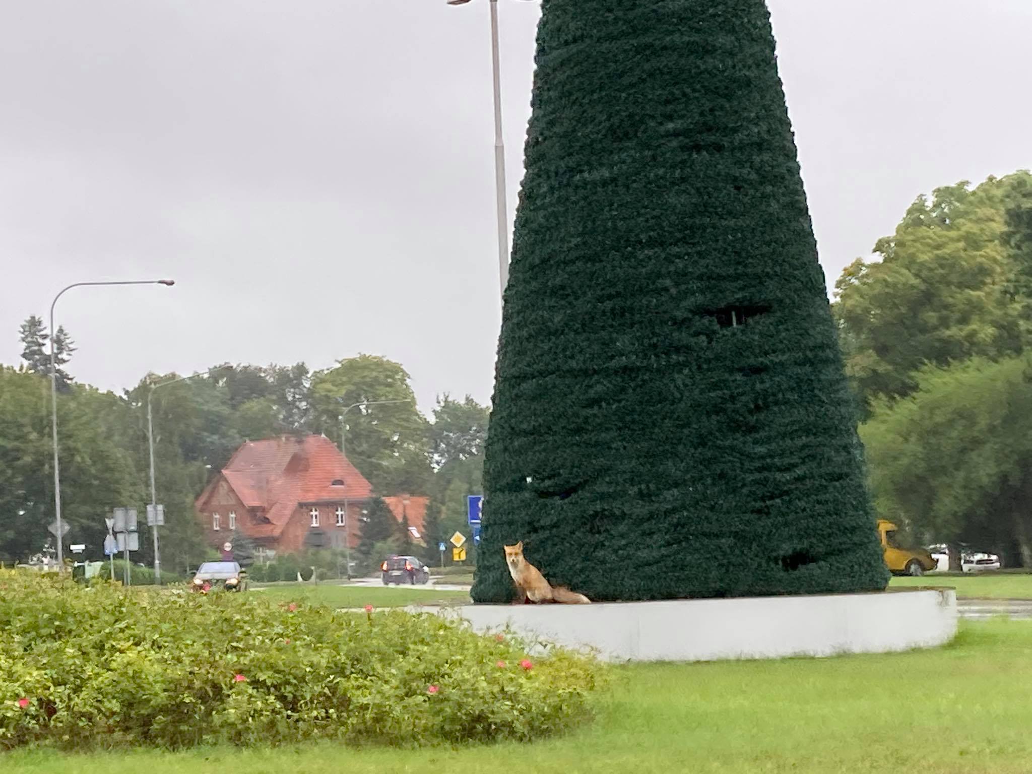 Lis pozował przy choince na rondzie Lis pozował przy choince na rondzie Lis pozował przy choince na rondzie