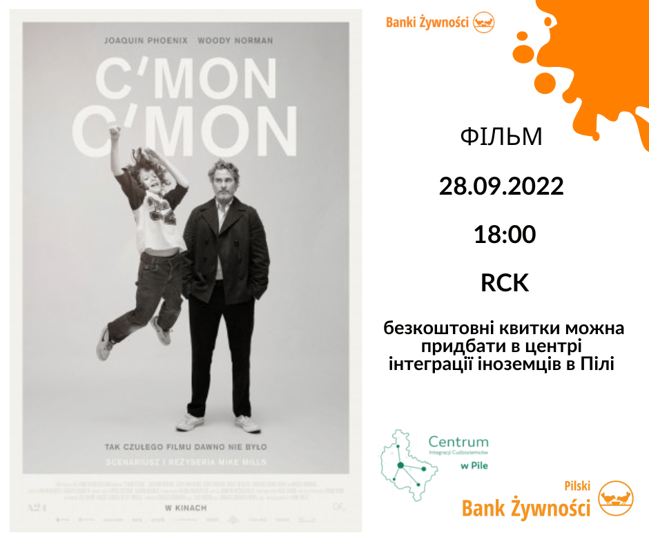Вже 28 вересня в обласному культурному центрі відбудеться інтеграційний показ фільму"C'mon c'mon". Фільм буде з двомовними субтитрами: польськими та українськими. Ми сердечно запрошуємо людей з України прийти і подивитися разом з жителями Піли. Вхід безкоштовний, так як організатор Пільський продовольчий банк отримав гранти на ці цілі від Федерації польських продовольчих банків.
