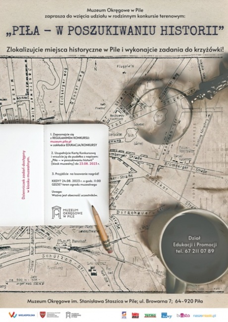 - zadaniem uczestników konkursu jest zlokalizowanie miejsc historycznych znajdujących się w Pile na podstawie "Dzienniczka zadań", a potem uzupełnienie krzyżówki. Z utworzonych wyrazów powstanie hasło. Rodzina zgłaszająca chęć uczestnictwa w konkursie musi posiadać dzienniczek zadań, który zapewnia organizator. Można go odebrać w kiosku muzealnym przy ul. Browarnej 7,