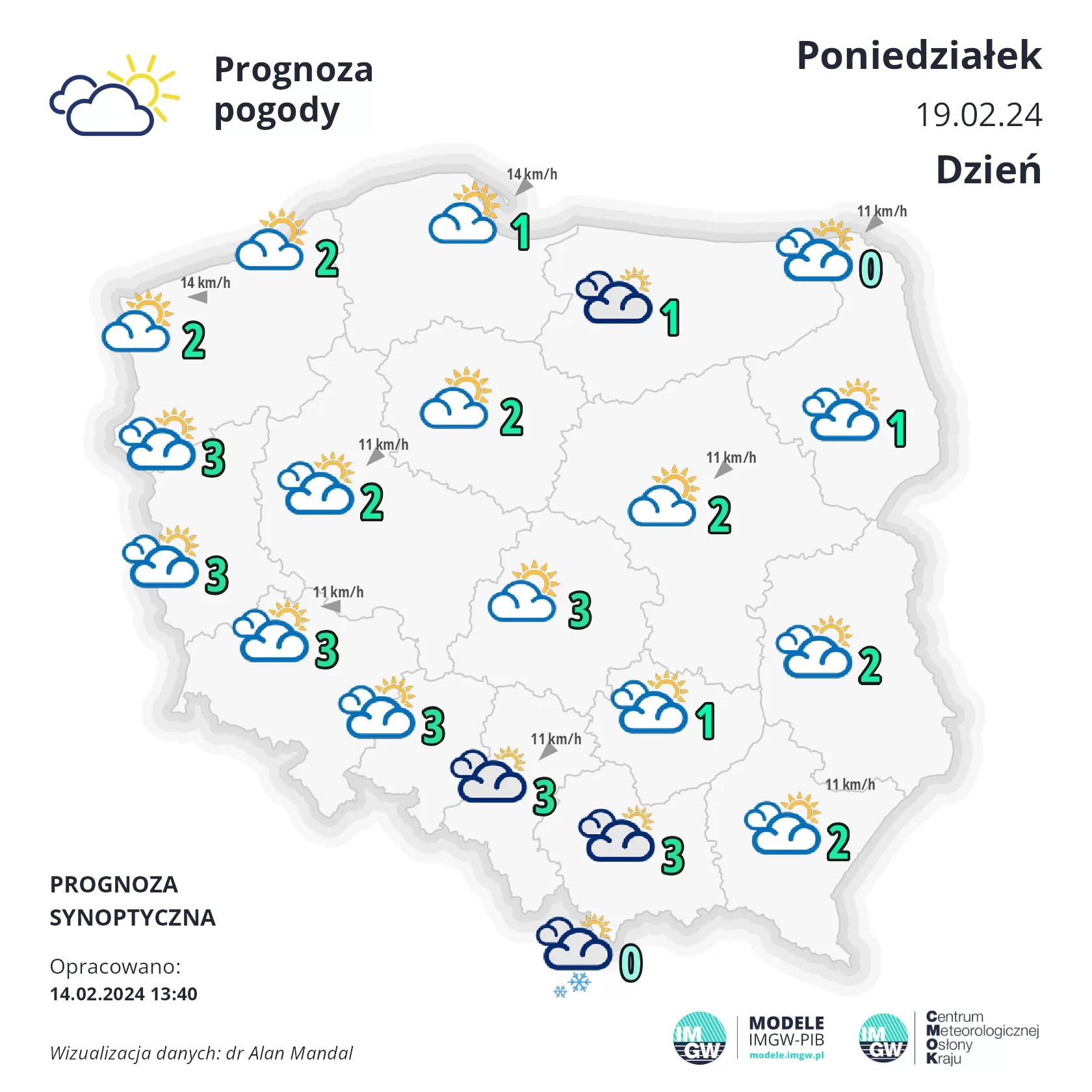 Zachmurzenie duże, miejscami opady deszczu, po południu przechodzące w deszcz ze śniegiem lub śnieg. Temperatura minimalna od -1°C do 2°C. Temperatura maksymalna od 1°C do 4°C. Wiatr słaby i umiarkowany, w nocy miejscami porywisty, północno-zachodni skręcający na północno-wschodni.