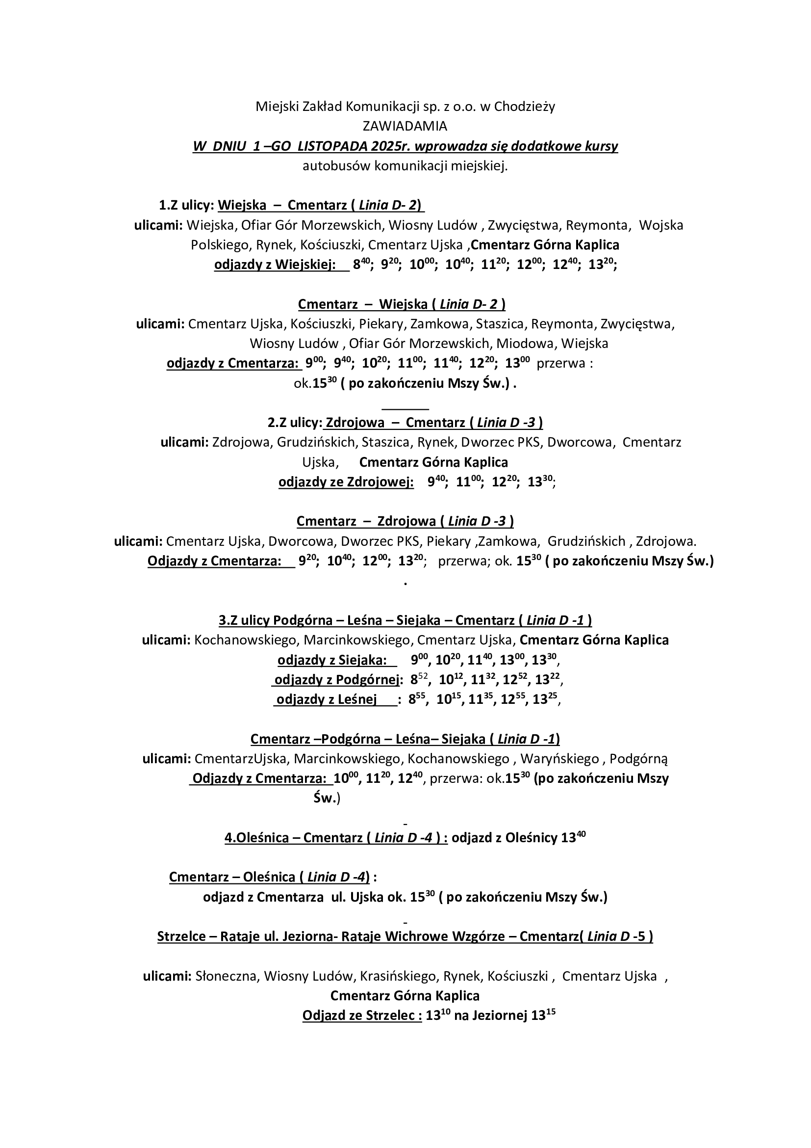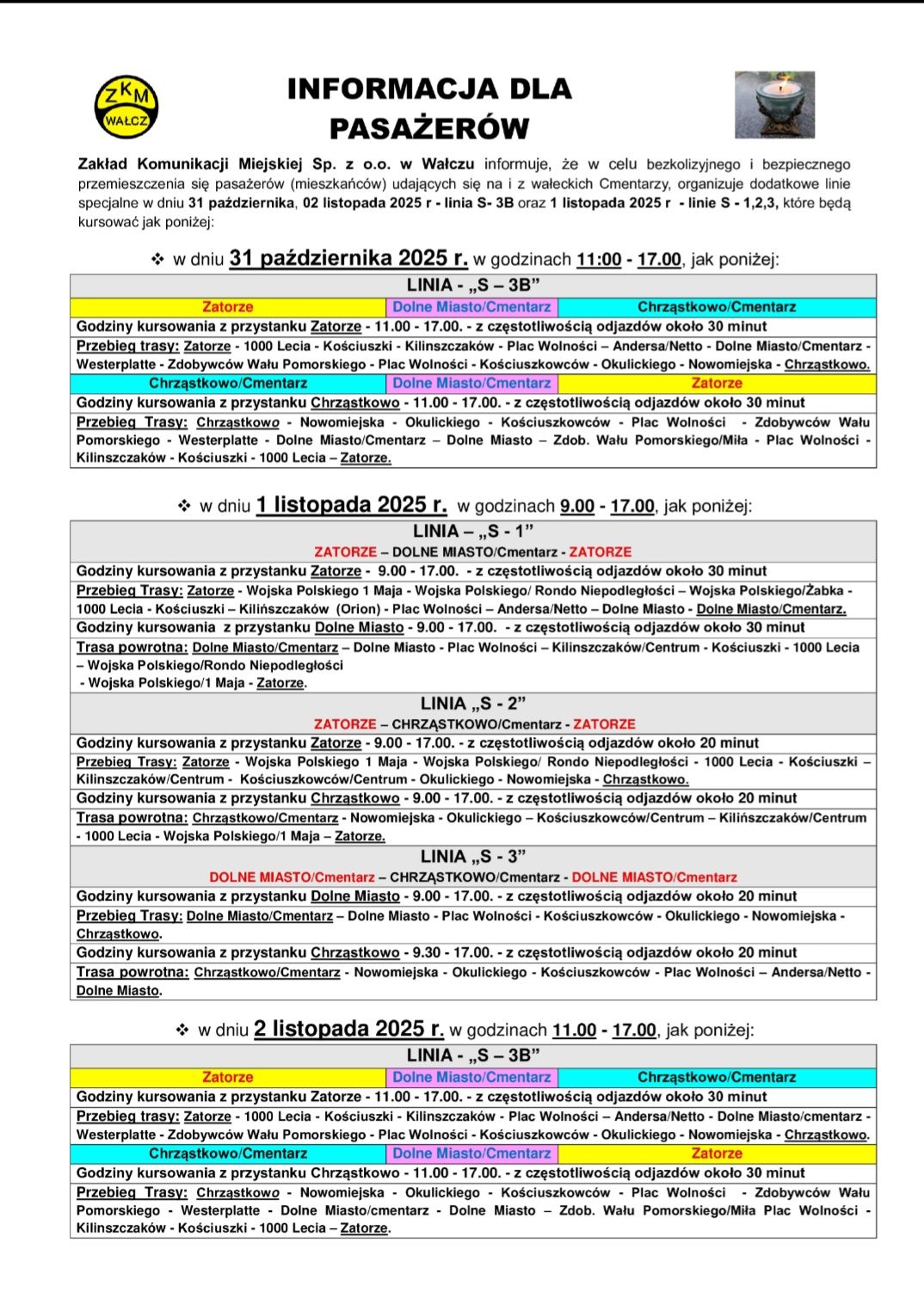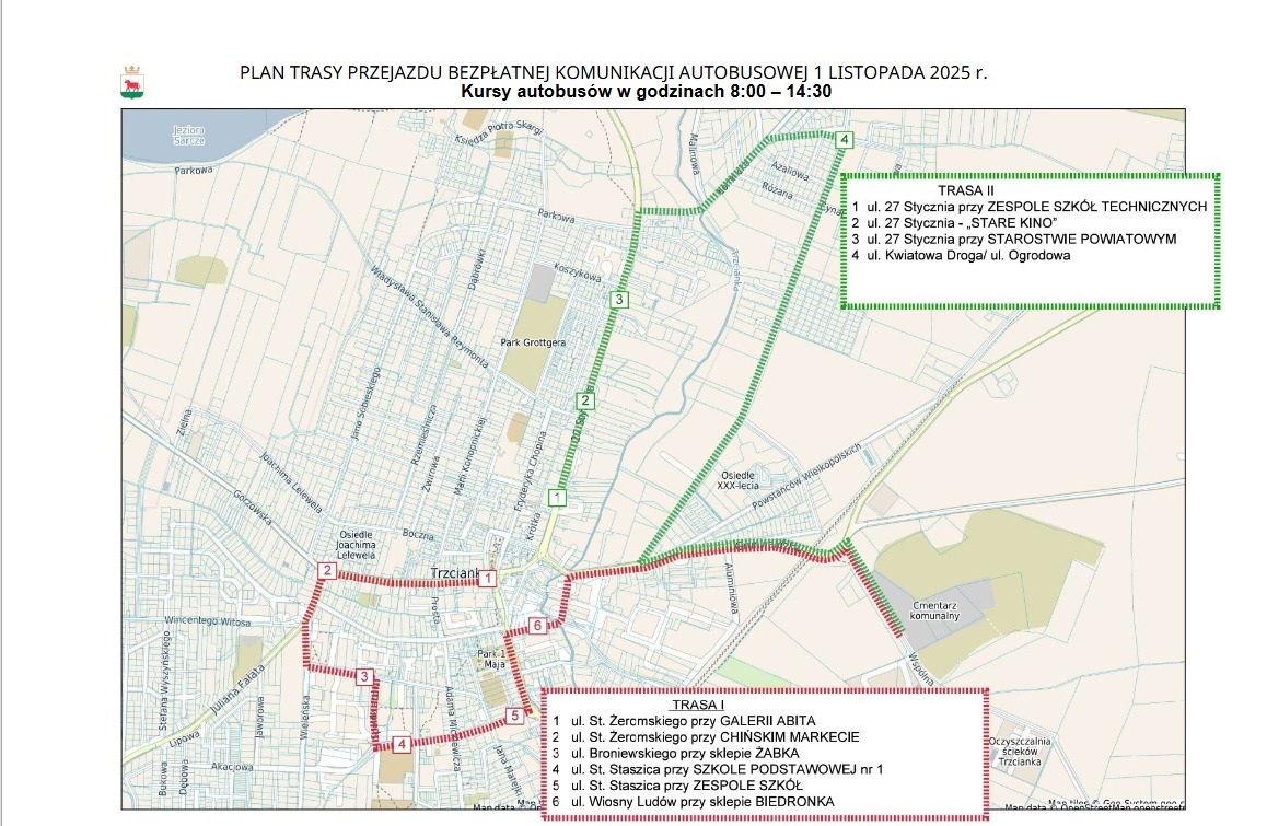 W Trzciance darmowa komunikacja autobusowa na cmentarz komunalny będzie kursować od godziny 8.00 do 14.30. Przewidziano dwie trasy - czerwoną i zieloną - obsługiwane łącznie przez siedem autobusów. Kierowcy będą mogli korzystać z dodatkowego parkingu przy ulicy Wspólnej.