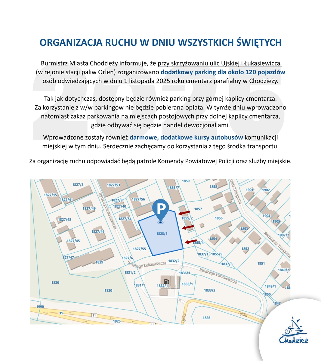 W Chodzieży przygotowano dodatkowy parking przy skrzyżowaniu ulic Ujskiej i Łukasiewicza, w rejonie stacji paliw. Dostępny będzie również parking przy górnej kaplicy cmentarza, natomiast przy dolnej obowiązywać będzie zakaz postoju z uwagi na handel. Miejski Zakład Komunikacji uruchomi dodatkowe, bezpłatne kursy autobusów. Wszystkie przejazdy w dniu 1 listopada będą darmowe.