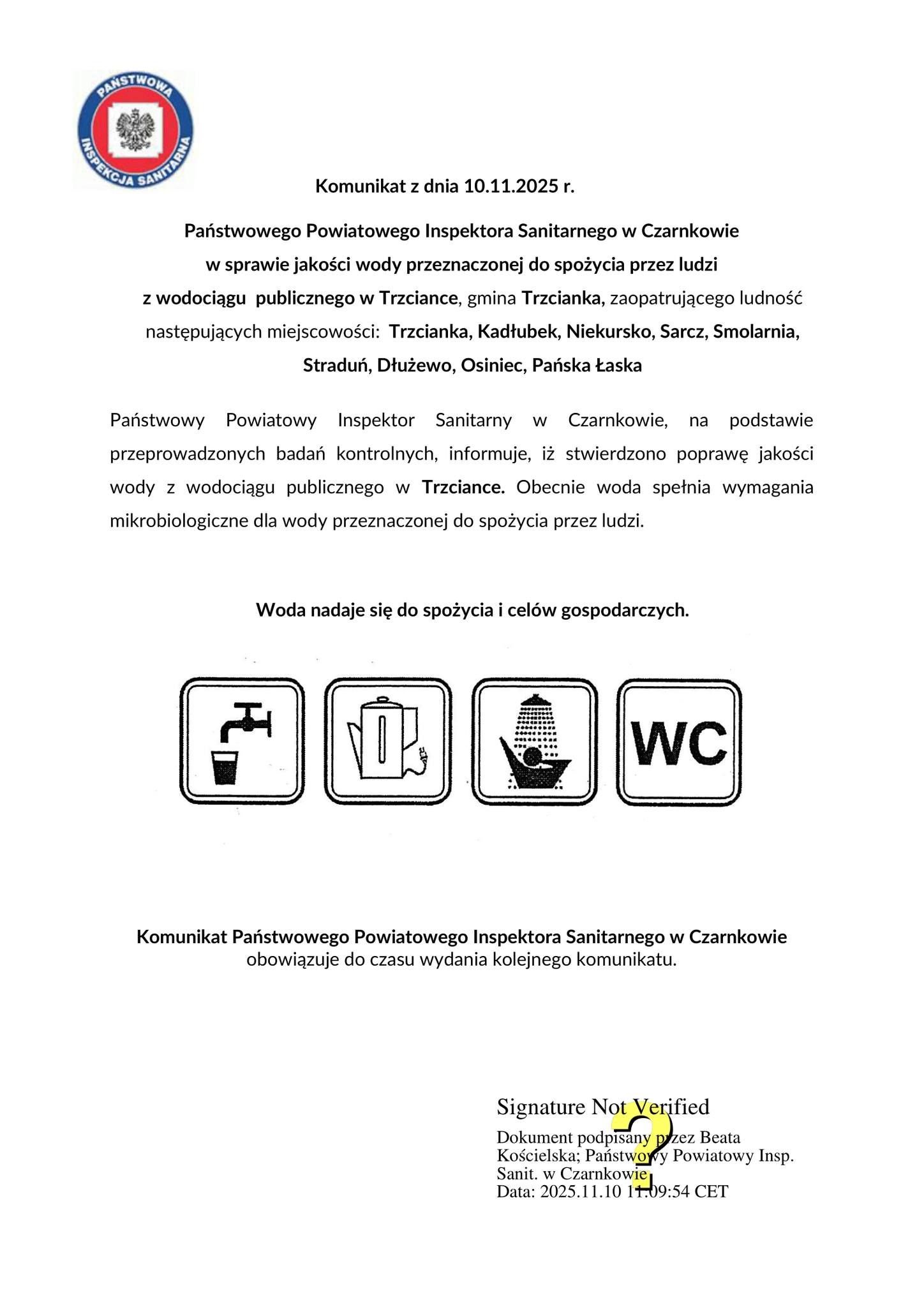 Na podstawie badań kontrolnych stwierdzono poprawę jakości wody z wodociągu publicznego w Trzciance. Już spełnia wymagania mikrobiologiczne dla wody przeznaczonej do spożycia przez ludzi.