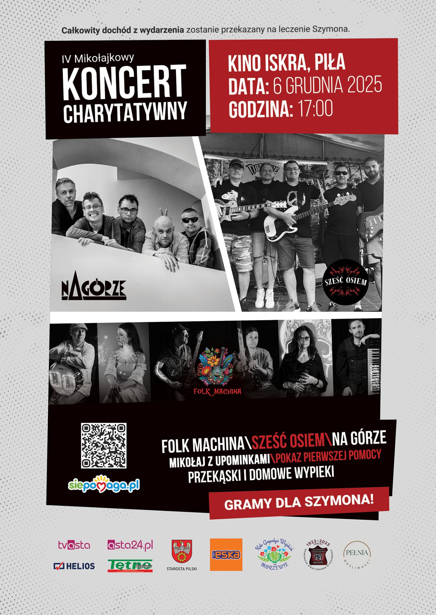 - Zapraszamy na wyjątkowy, czwarty już koncert Mikołajkowy, podczas którego muzyka połączy nas wszystkich w jednym, najważniejszym celu — pomocy Szymonowi Lipińskiemu z Piły. Szymon zmaga się ze śmiertelną chorobą genetyczną DMD (dystrofią mięśniową Duchenne’a) i walczy o życie, zbierając środki na najdroższy lek na świecie - mówi Kamil Adamczyk, organizator koncertu.
