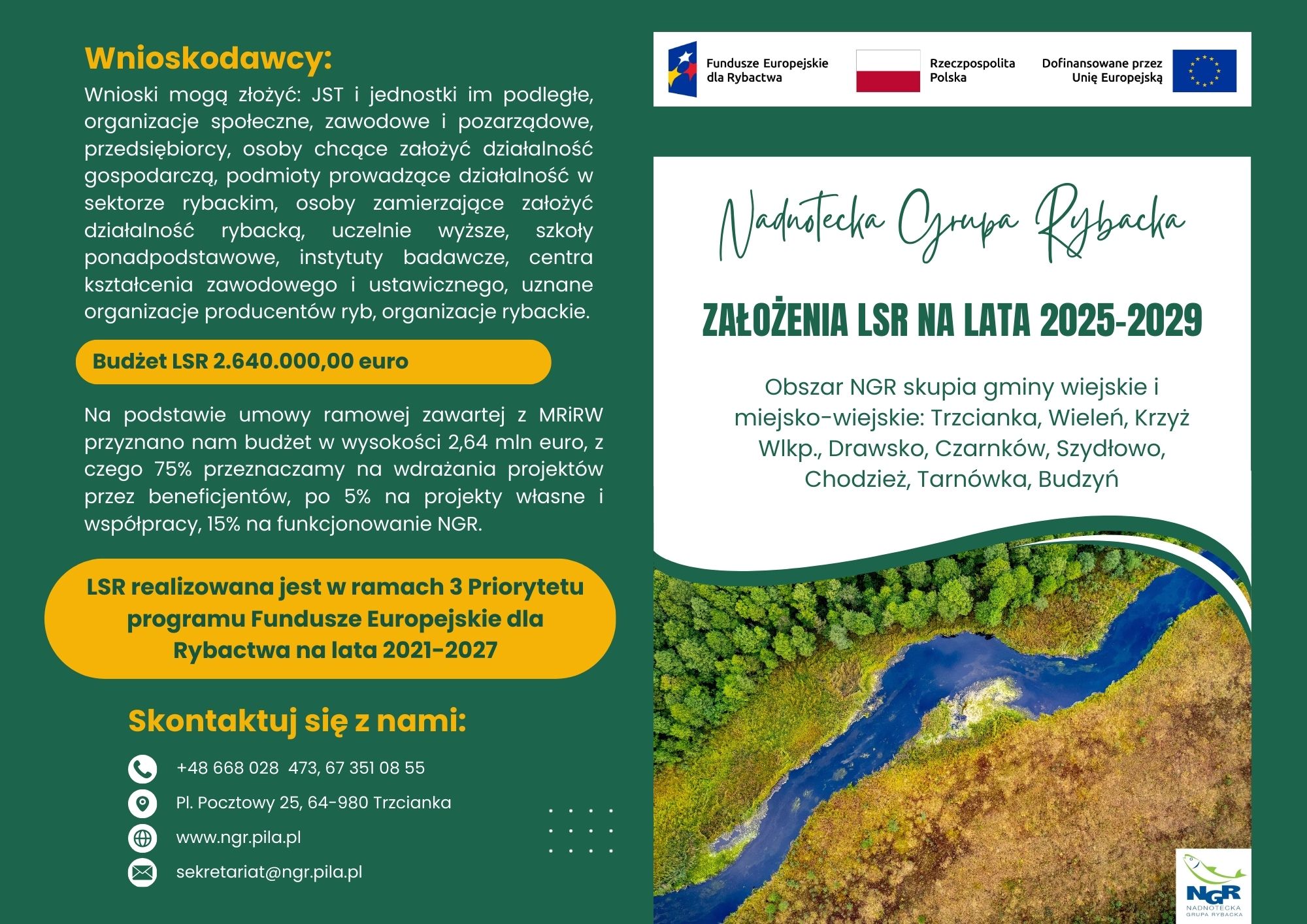 Nadnotecka Grupa Rybacka rozpoczyna wdrażanie nowej, kompleksowej Lokalnej Strategii Rozwoju (LSR) na lata 2025-2029. Jest to już kolejna – trzecia strategia, realizowana przez Rybacką Lokalną Grupę Działania. Dokument został opracowany we współpracy z lokalnymi mieszkańcami, przedsiębiorcami oraz instytucjami, działającymi na terenie dziewięciu gmin: Trzcianki, Wielenia, Drawska, Szydłowa, Krzyża Wielkopolskiego, Tarnówki, Budzynia, Chodzieży (gmina wiejska), Czarnkowa (gmina wiejska). To sprawiło, że jest ona dostosowana do realnych potrzeb i oczekiwań lokalnej społeczności. Szczególne znaczenie dla powstania i realizacji LSR ma sektor rybacki czyli lokalni hodowcy ryb, przetwórcy oraz użytkownicy wód.