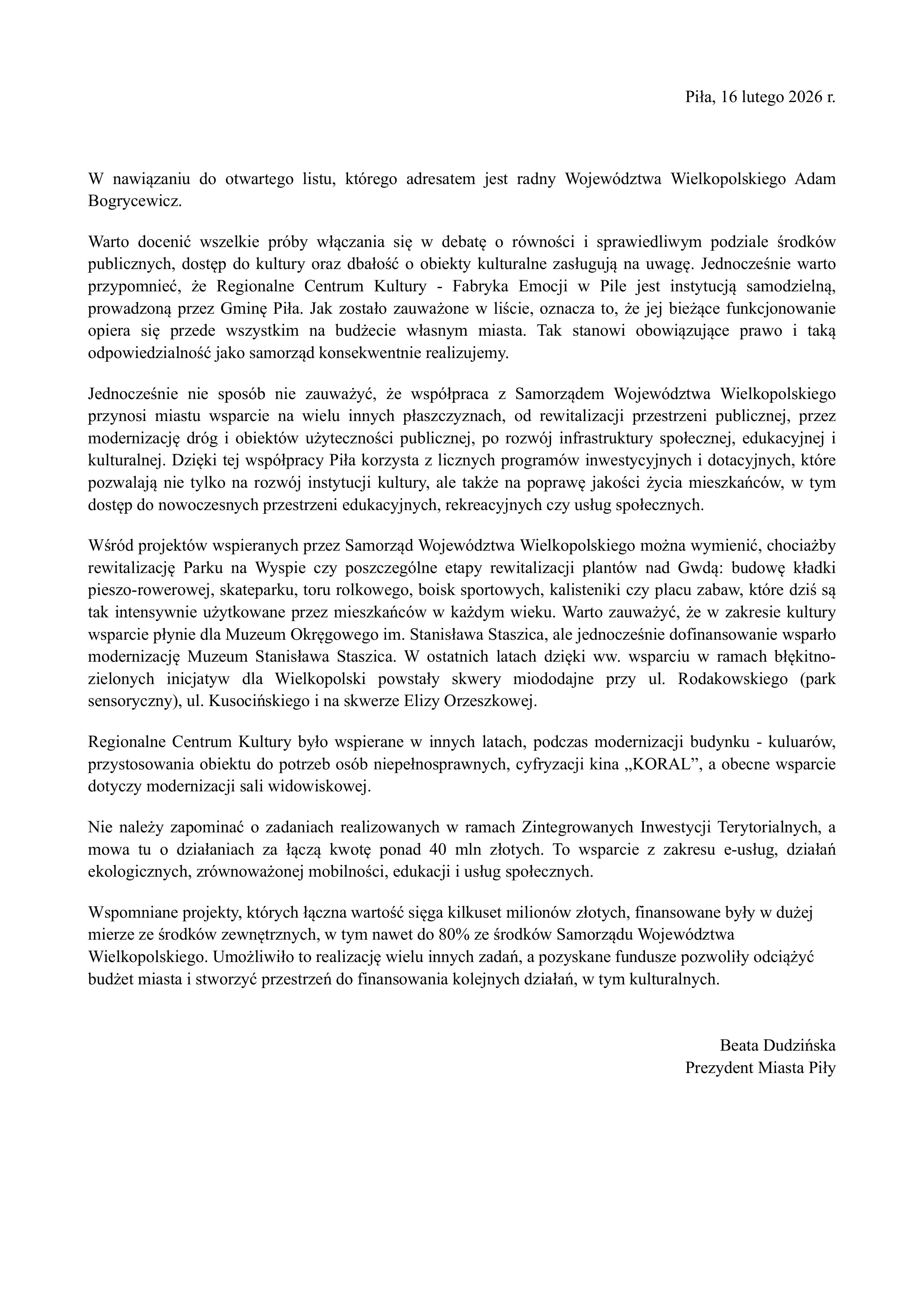 Regionalne Centrum Kultury nie jest instytucją marszałkowską. Zdaniem radnego miasto powinno podjąć rozmowy z zarządem województwa o zwiększenie corocznego finansowania instytucji, ze względu na jej ponadregionalny charakter. W ubiegłym roku z oferty RCK-u skorzystało ponad 200 tys. osób. Swój apel radny Adam Bogrycewicz zawarł także w liście otwartym do prezydent Piły, z prośbą o podjęcie działań w tej sprawie. W odpowiedzi prezydent Beata Dudzińska zaznacza, że choć warto docenić wszelkie próby włączania się w debatę o równości i sprawiedliwym podziale środków publicznych - to Regionalne Centrum Kultury jest jednostka miejską. Tegoroczny budżet Regionalnego Centrum Kultury to ponad 5 mln zł.