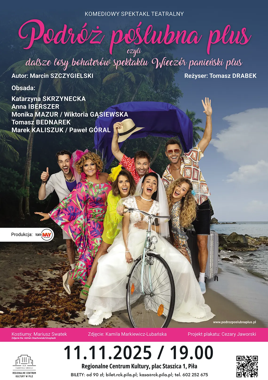 Po sukcesie spektaklu pt. "Wieczór panieński plus", autor Marcin Szczygielski napisał najnowszą komedię pt. "Podróż poślubna plus", będącą kontynuacją losów bohaterów "Wieczoru.". Przed bohaterami nowe, niekoniecznie usłane różami życie. Jednak nim ono się rozpocznie, pora na miłość i upojny miesiąc miodowy. W podróż poślubną na egzotyczną wyspę wyruszają dwie młode pary plus jedna niedoszła panna młoda, której przyjaciele nie mają serca zostawić samej w domu. Jednak nic nie idzie zgodnie z planem. Zamiast do raju, bohaterowie trafiają prosto w oko cyklonu, w którym muszą zmierzyć z huraganem, niespodziewanymi "atrakcjami" i niezwykle zabawną recepcjonistką hotelu. "Podróż poślubna plus" na pewno przypadnie Wam do gustu, podobnie jak "Wieczór panieński plus"! Zapraszamy Państwa do naszej podróży.