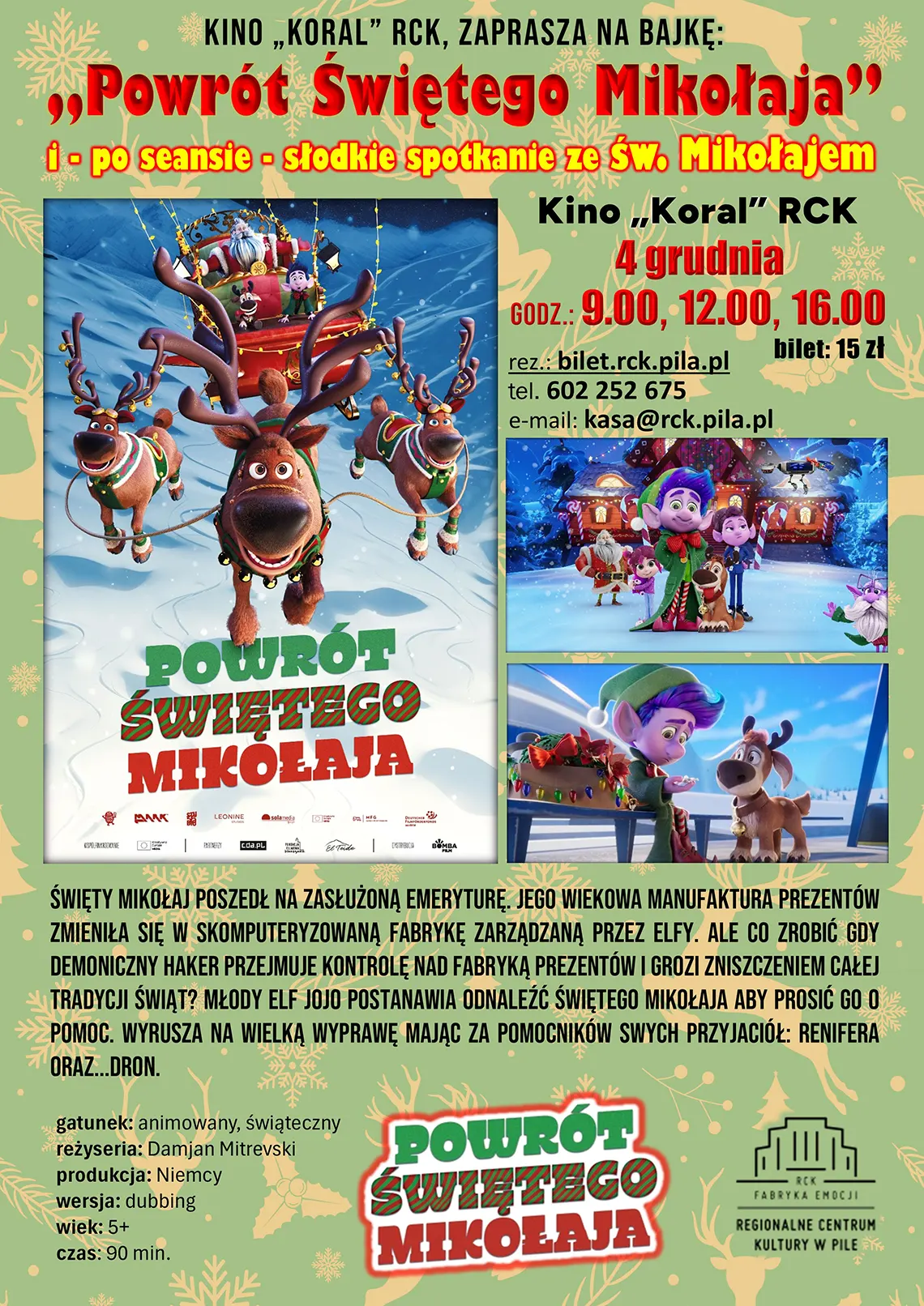 Już w czwartek, 4 grudnia w godzinach: 9:00, 12:00 i 16:00 w kinie Koral odbędzie się seans filmu ,,Powrót Świętego Mikołaja".