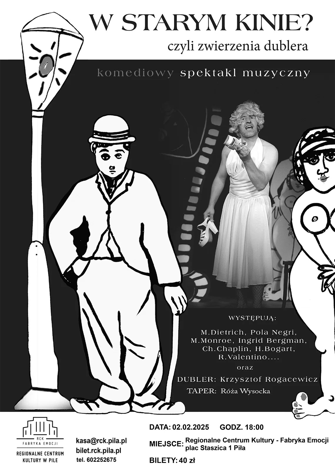 Krzysztof Rogacewicz w swoim, wznowionym niedawno, muzycznym monodramie pt."W starym kinie, czyli zwierzenia dublera". W godzinnym programie wciela się w postaci kreowane przez Charlie Chaplina, Marlenę Dietrich, Polę Negri (czyli Apolonię Chałupiec), Humphreya Bogarta i… Marylin Monroe. I, oczywiście, śpiewa niezapomniane przeboje z tamtych filmów. Śpiewa po angielsku, niemiecku (Mackie Majcher z "Opery z trzy grosze" Brechta/Weila), francusku, hiszpańsku no i po Polsku: "Ach śpij, kochanie" (z filmu "Paweł i Gaweł", 1938 r.) i "Zagrajmy jeszcze raz vabank", z kultowej komedii "Vabank" Juliusza Machulskiego.