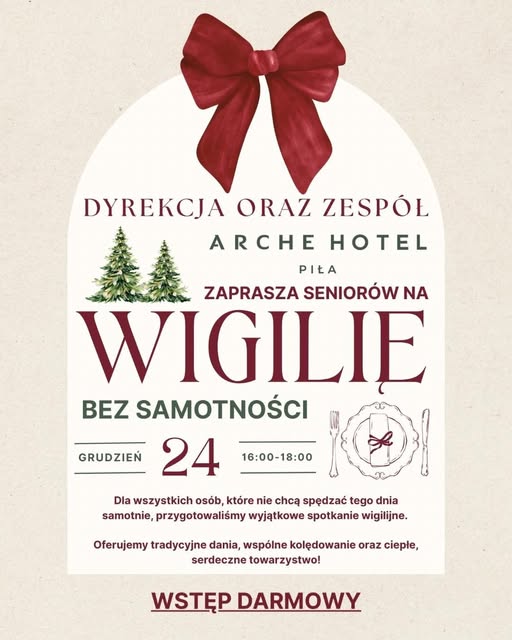 W Wigilię Bożego Narodzenia, (24 grudnia) o godz. 16:00 w Arche Hotel odbędzie się uroczysta kolacja dla seniorów pn. ,,Wigilia bez samotności".